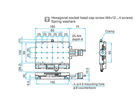 Guide | ▶The TAMC-20201(LS) supports hole patterns of both 180 × 180mm and 175 × 175mm, and can be directly mounted on a 25mm pitch optical breadboard. ▶The models with the part number suffix LS or LSA are fitted with a digital display scale with a readable resolution of 10μm. ▶The digital display scale has a reset function and a memory function to retain the value at the time the power is turned off (redisplay the value being displayed when the power is turned off). |